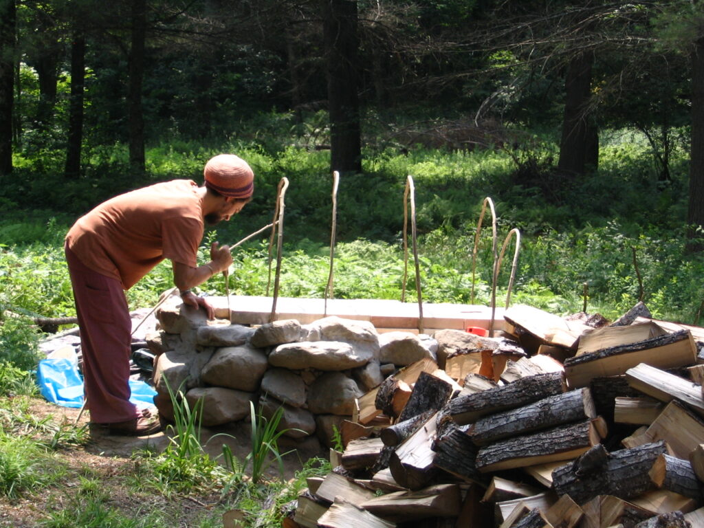 First, you need to collect a good amount of thin straight green saplings or branches and de-branch them. Ideally, you find lengths that are very flexible and don’t taper too much. Start with your thicker sticks pushing the ends down as deep as you can into the sand and gravel (in the base of your oven). Try to get them as close to the sides of the hearth as you can. Begin in the center and measure your oven dome height and adjust the stick accordingly. Next make one hoop for the oven door, again measuring your door height. Make sure it is 63% of the dome height. Now span the distance between these two hoops making a gradual slope.